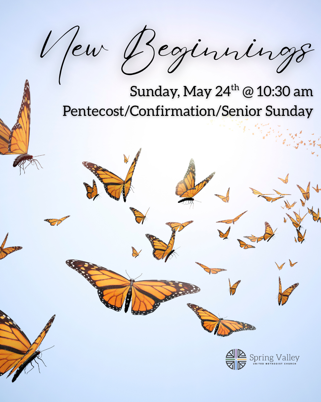 Senior Sunday May 24: This Pentecost Sunday, we celebrate the work of the Holy Spirit in the lives of Spring Valley students! Join us our young people lead worship and make new commitments to live out their faith.