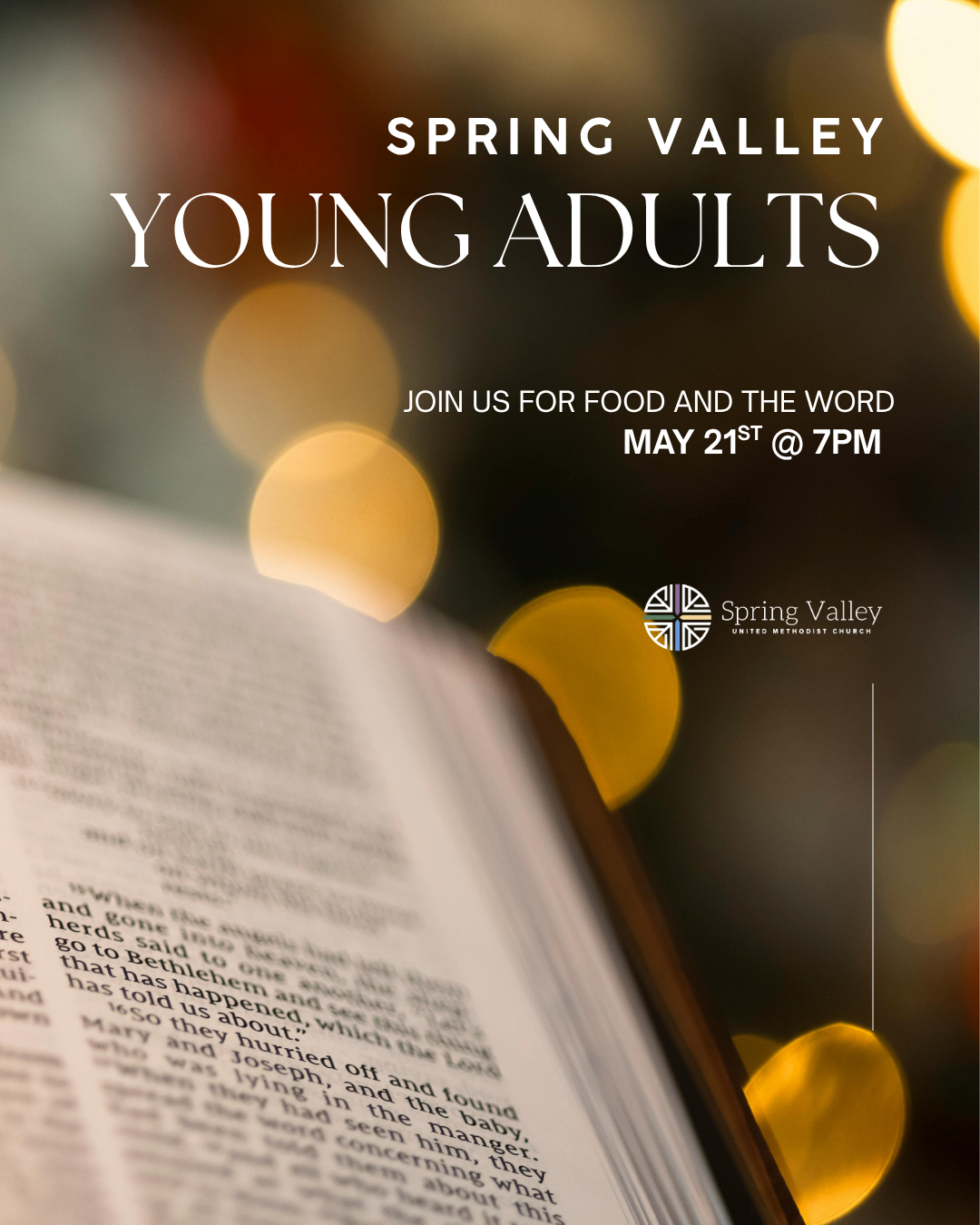 SVUMC Young Adults Thursday, May 21, 2026 7:00 PM 8:30 PM 19:00 20:30 Google Calendar ICS Join our Young Adult Bible Study every other Thursday night from 7:00 pm - 8:30 pm for food and the word.